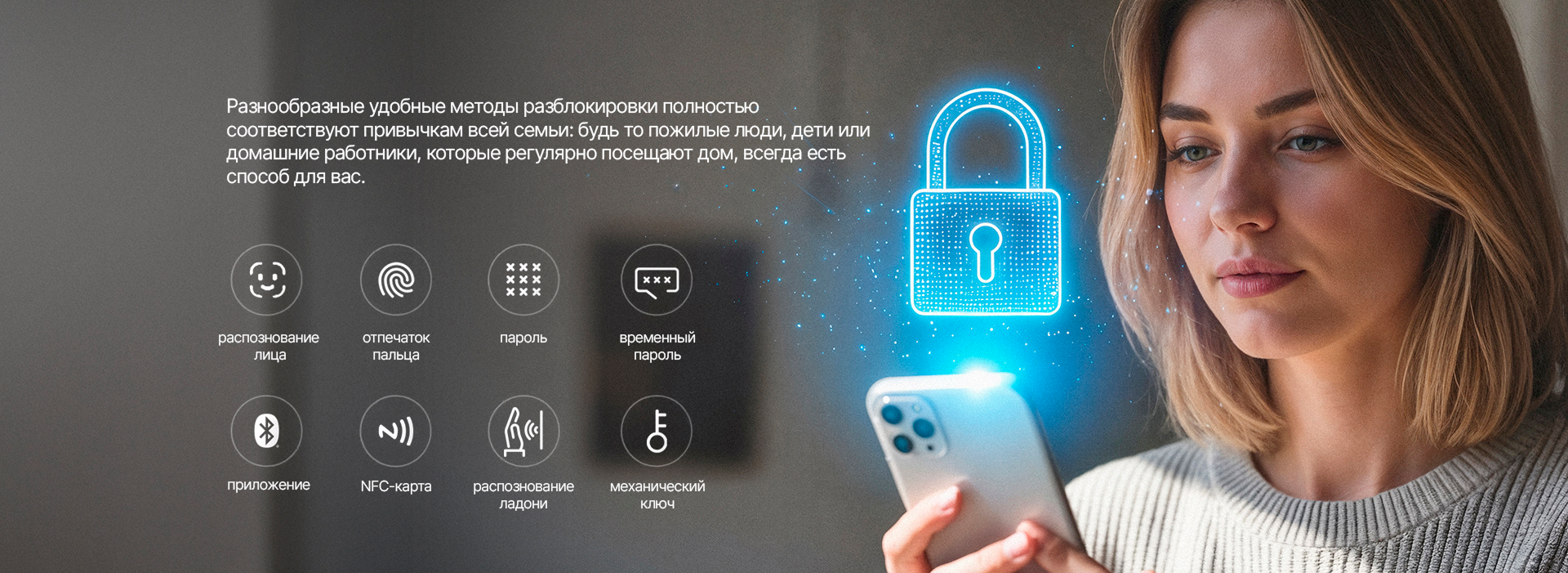 FaceID IC-карта Механический ключ Отпечаток ладони Отпечаток пальца Пароль Приложение